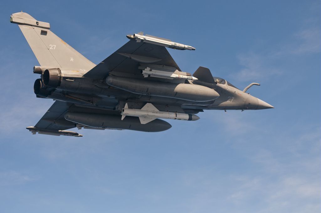© Marine Nationale - Le Rafale M27 équipé du missile air-mer AM39 EXOCET, et des missiles air-air MICA IR et EM.